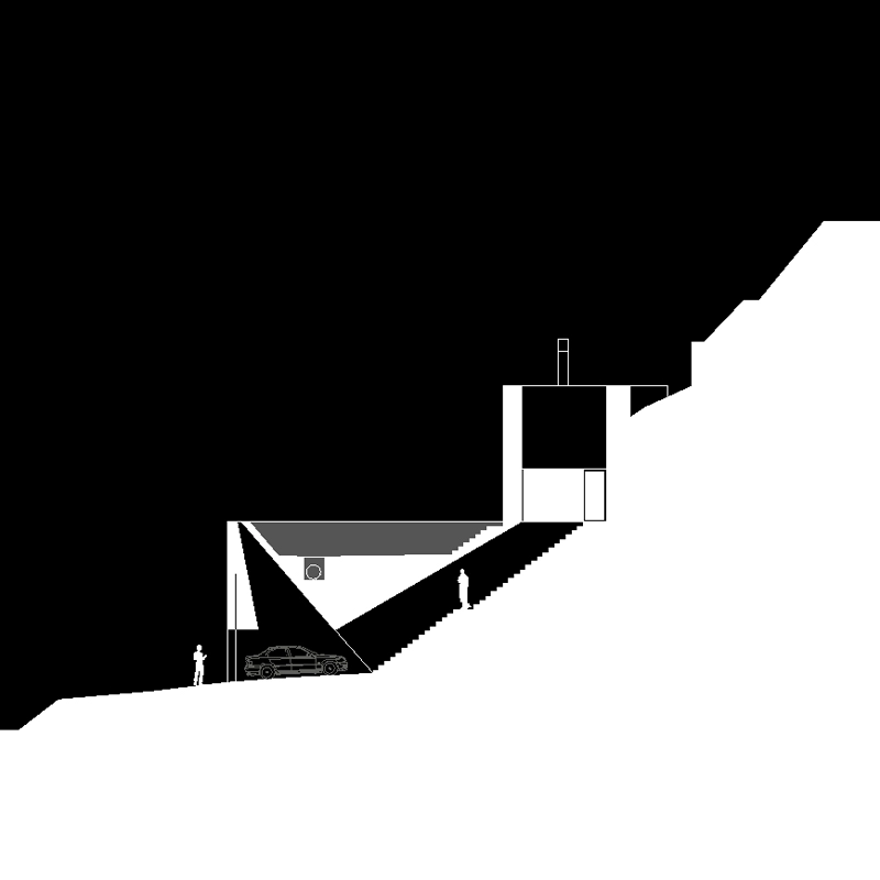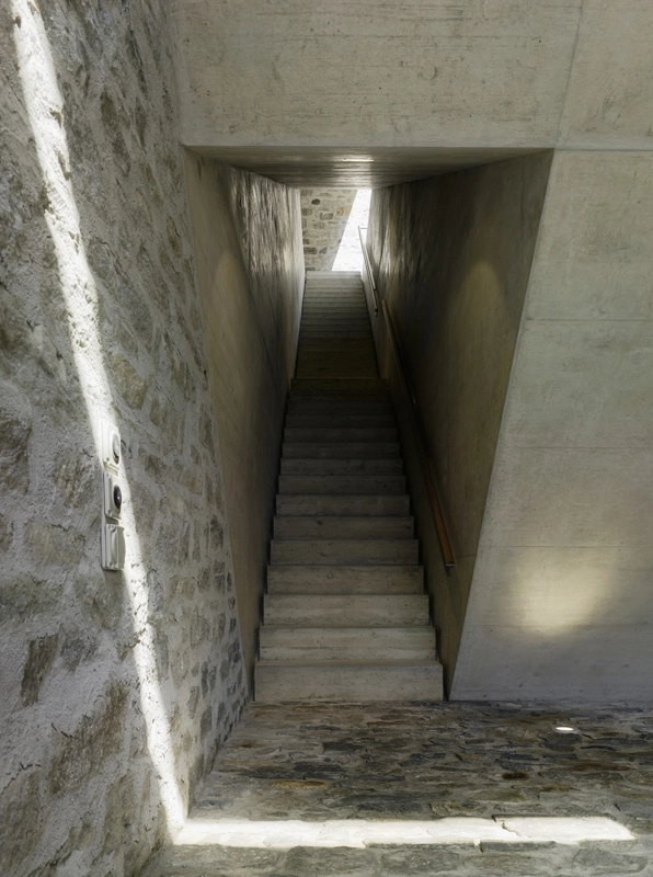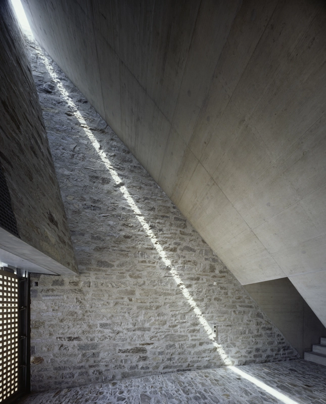 il progetto reagisce con discrezione ad un problema dei nostri giorni: costruire nel caos urbanistico. a causa di ciò si rinuncia agli attributi classici di una casa: unicamente due semplici cubi di pietra, tagliati, posti uno contro l’altro, che sporgono frammentari dalla montagna; fanno parte del paesaggio più che del quartiere, sono più un muro che una casa, sottraendosi ad una classificazione temporale.