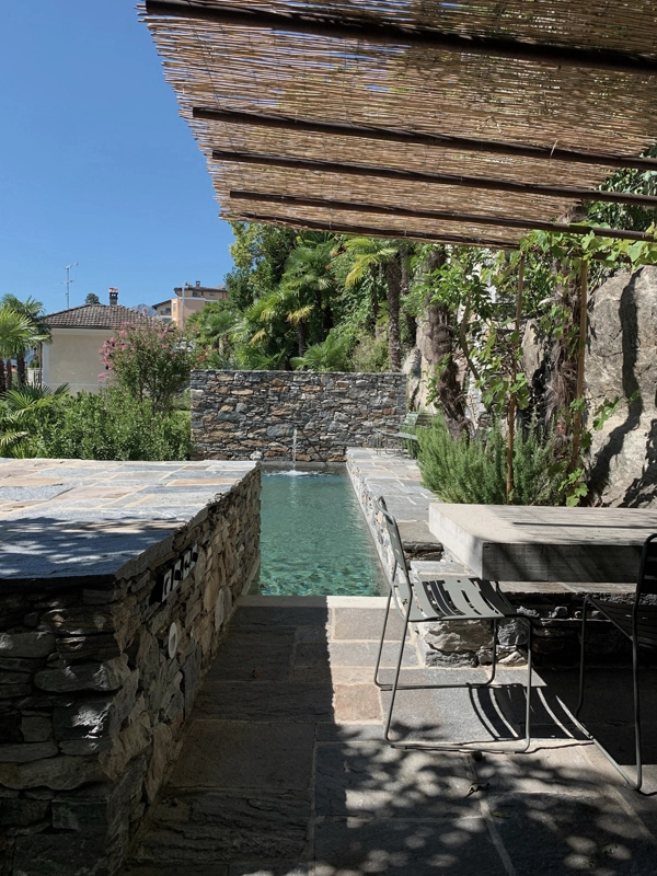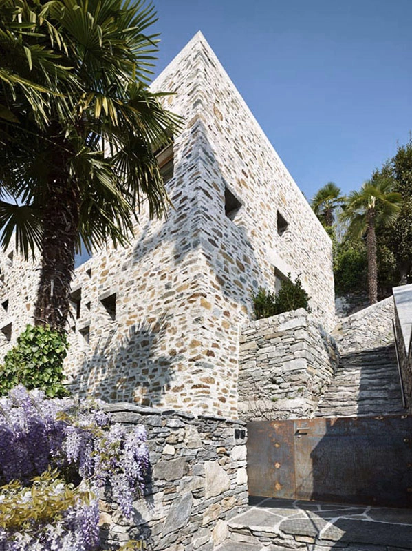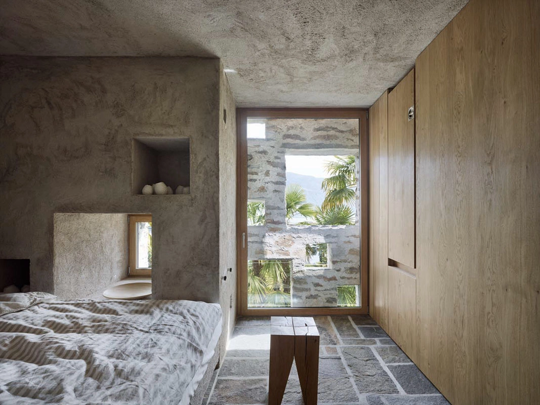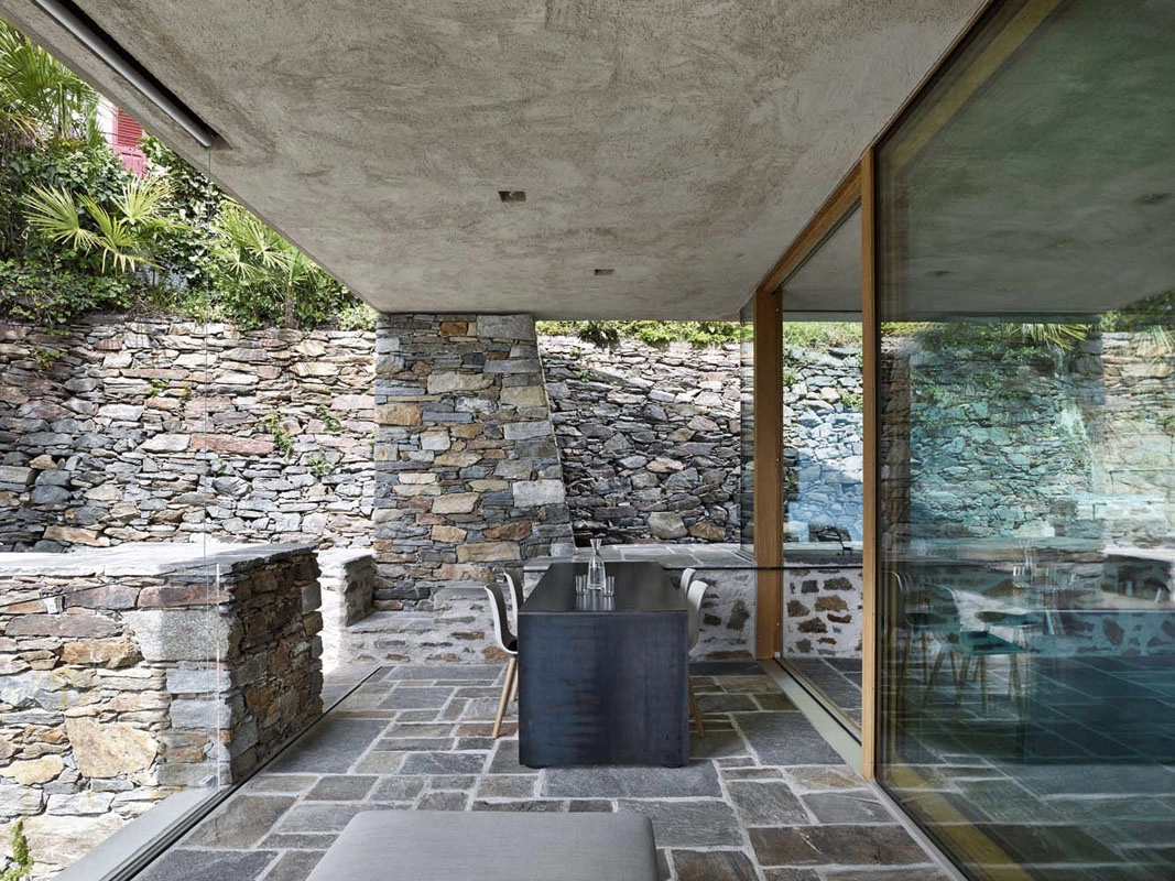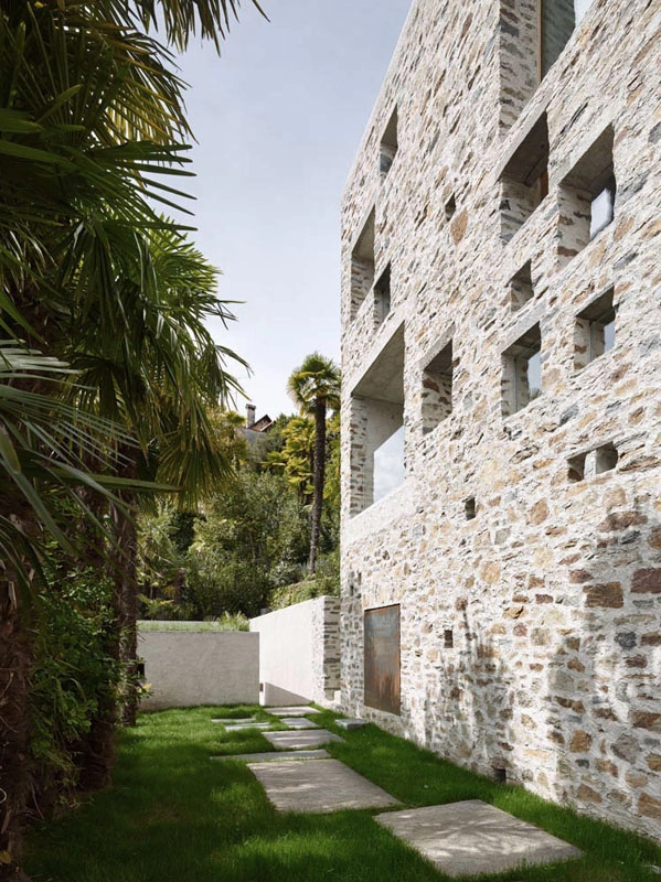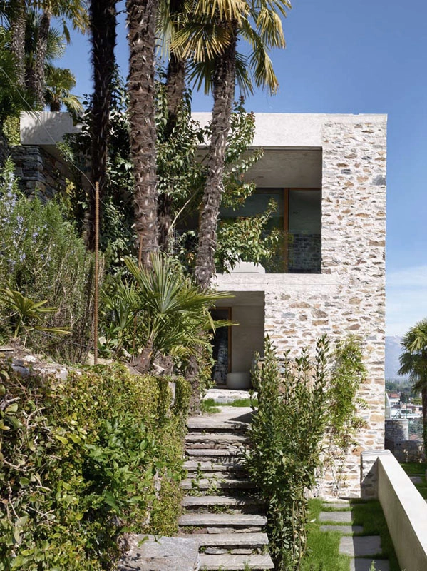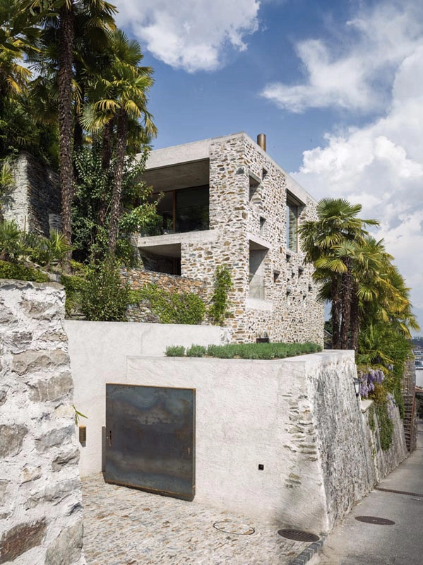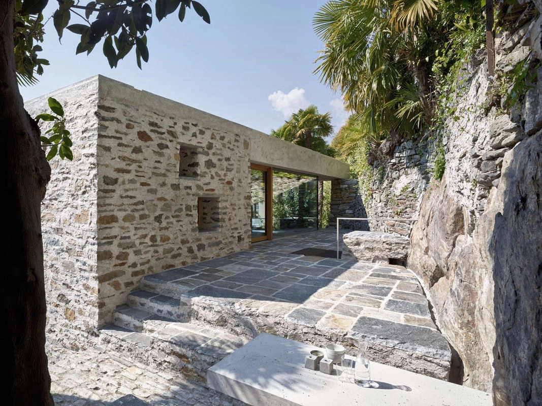 das umbauprojekt reagiert auf den ort und den terrassierten garten mit seinen steinmauern. durch die wahl von natursteinmauern (als aussenverkleidung und im wohnraum auch für innenwände) mit traditionellem rasapietra-verputz (halbverputz, kombiniert mit komplett verputzten mauern) erhält das haus eine neue und ortsspezifische identität und fügt sich mit selbstverständlichkeit in den garten und das quartier ein.