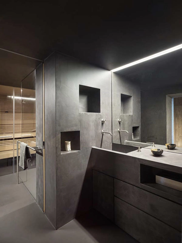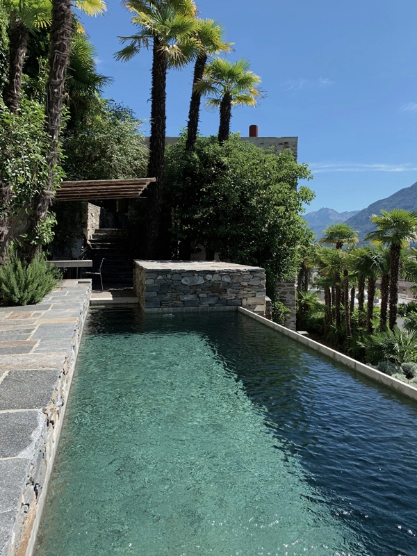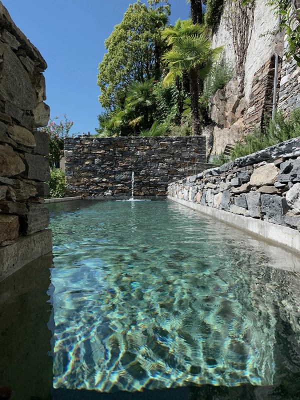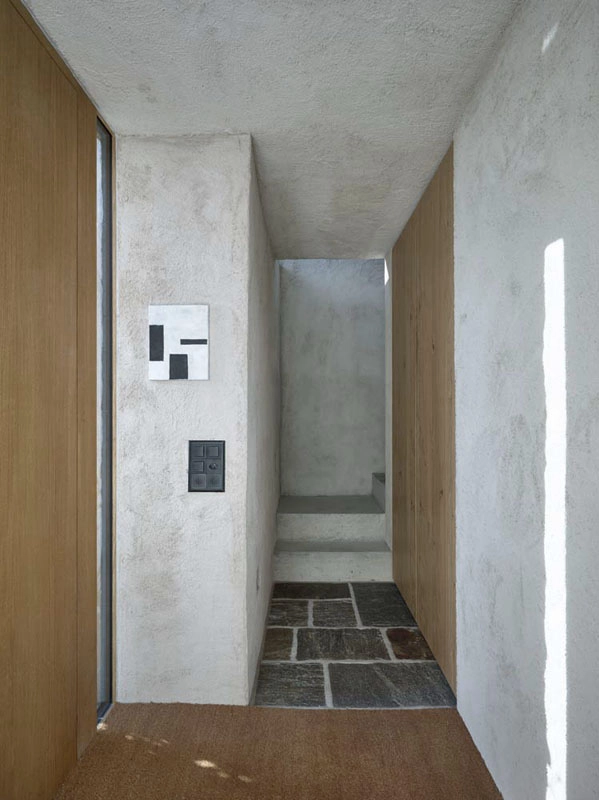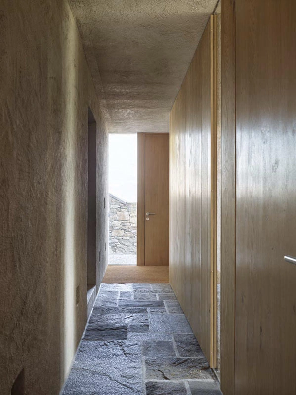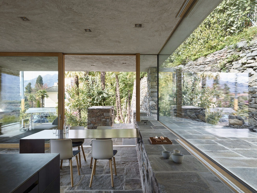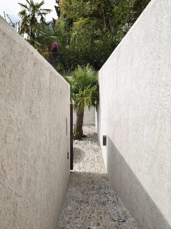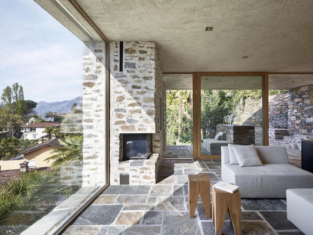 das umbauprojekt reagiert auf den ort und den terrassierten garten mit seinen steinmauern. durch die wahl von natursteinmauern (als aussenverkleidung und im wohnraum auch für innenwände) mit traditionellem rasapietra-verputz (halbverputz, kombiniert mit komplett verputzten mauern) erhält das haus eine neue und ortsspezifische identität und fügt sich mit selbstverständlichkeit in den garten und das quartier ein.
