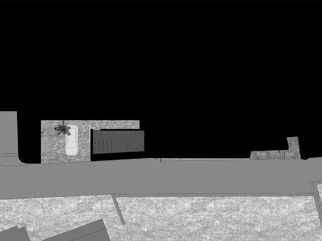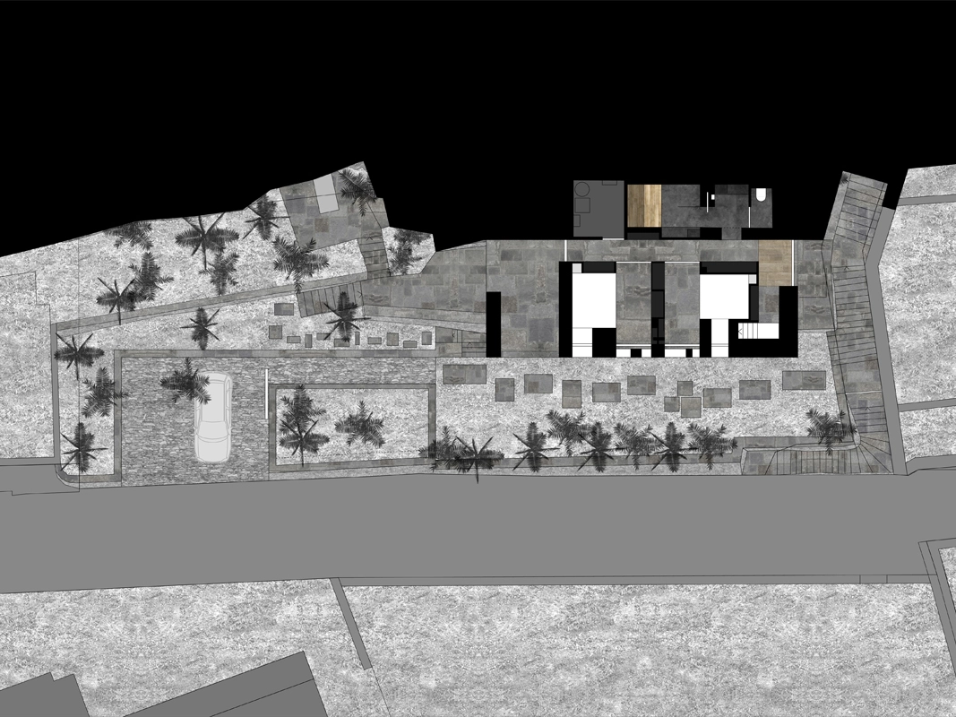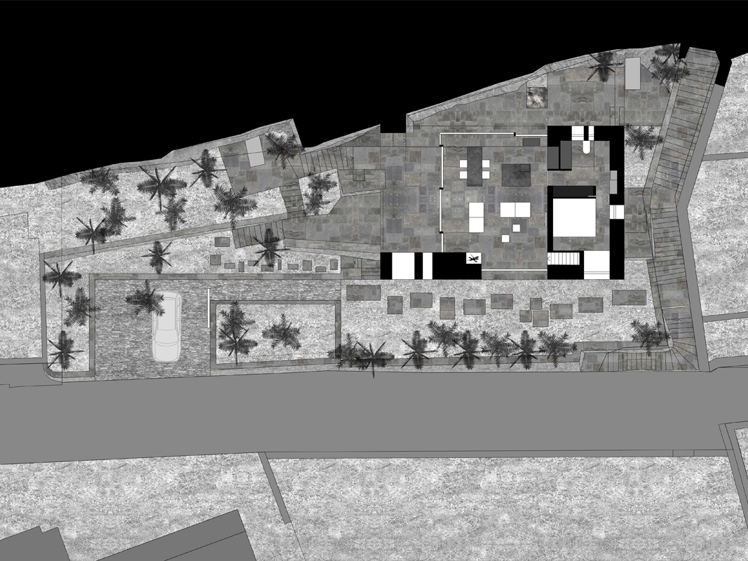 die bestehende natursteinstützmauer entlang der talseitigen strasse wird in einem teilbereich abgebrochen, um eine neue grosszügige eingangssituation mit natursteingepflästertem parkplatz und gartentor zu schaffen, hinter der verbleibenden stützmauer wird unter terrain ein zusätzlicher technik- /velo- und abstellraum integriert.