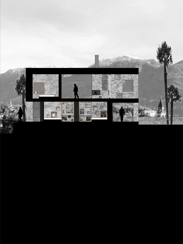 das obergeschoss beherbergt östlich einen schlafraum, dusche/wc und schrankzone, und eine grosszügige wohn-/ess-/kochhalle, welche sich talseitig mit einer grossen öffnung zur aussicht, und mit einer über-eck-vollverglasung zur aussenloggia und zum westlichen palmen- und bergseitigen felsengarten mit badebrunnen öffnet; innen und aussen werden als einheit erlebt, das feuer des innen- und aussencheminées verbindet sich optisch mit dem wasser des lago maggiore.