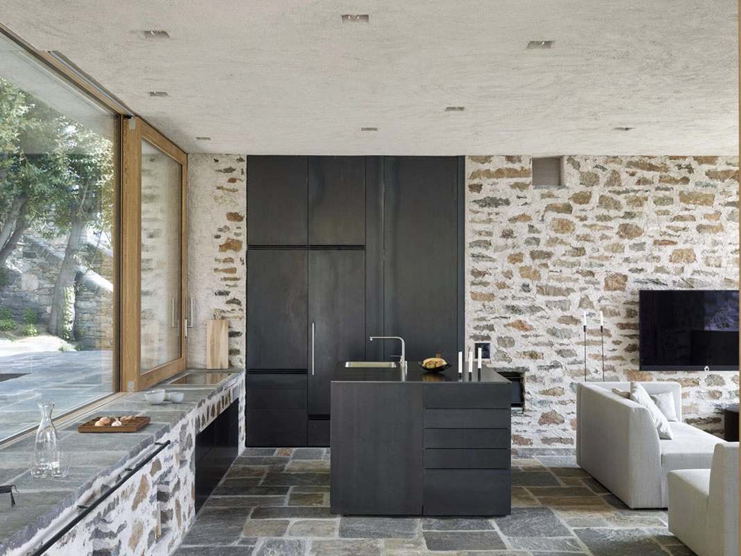 das auf einen einfachen steinernen kubus reduzierte neubauartig umgebaute haus wird mit den alten gartenmauern förmlich verwoben und bildet eine scheinbar gewachsene einheit mit dem alten garten.