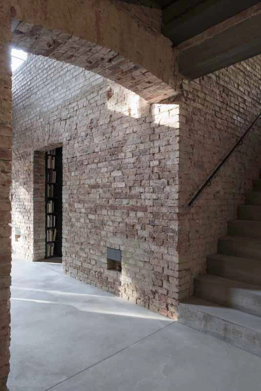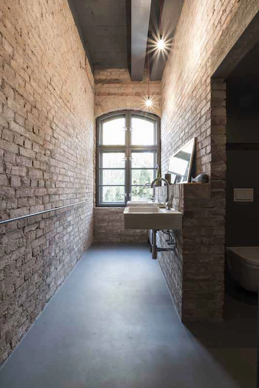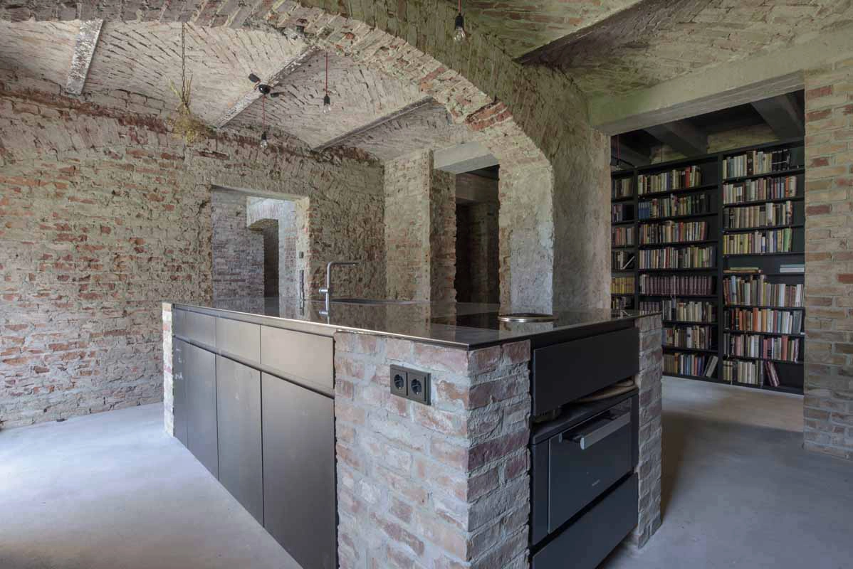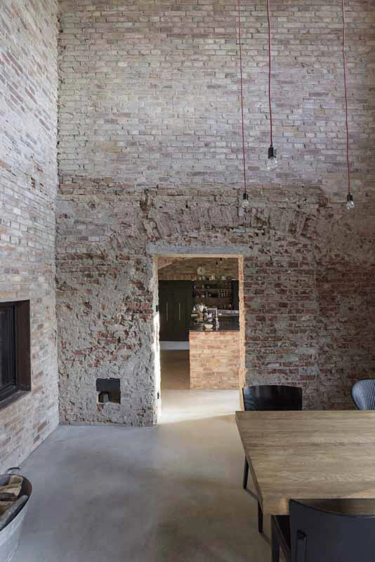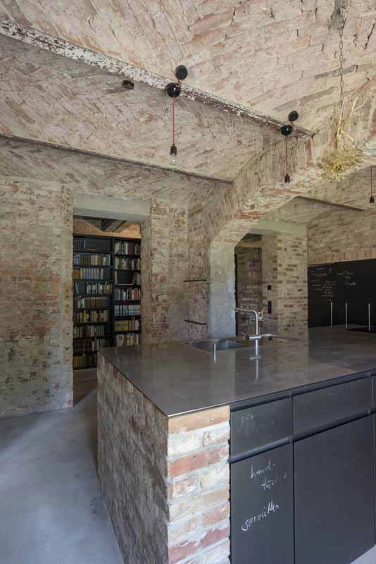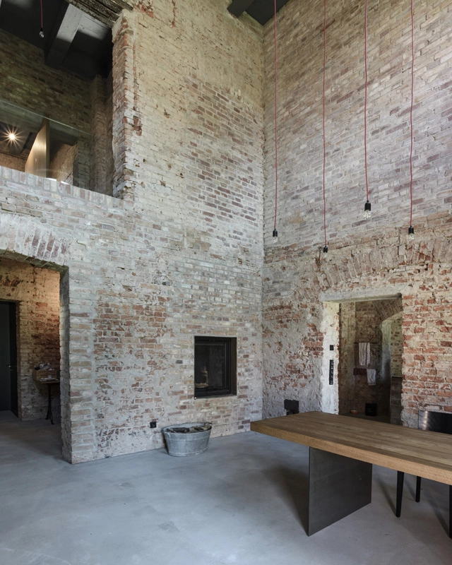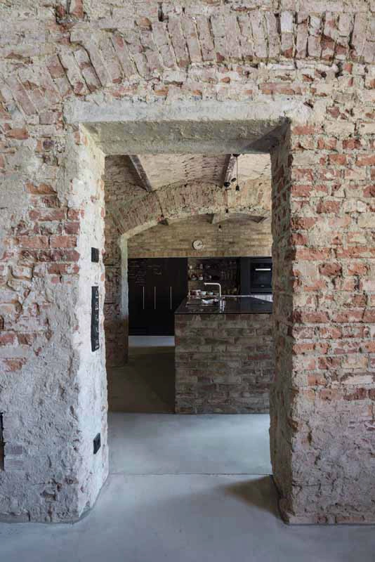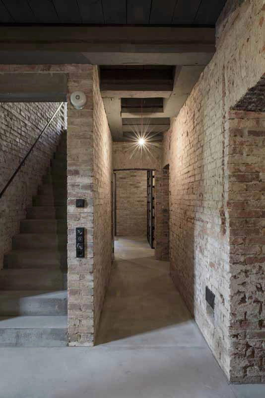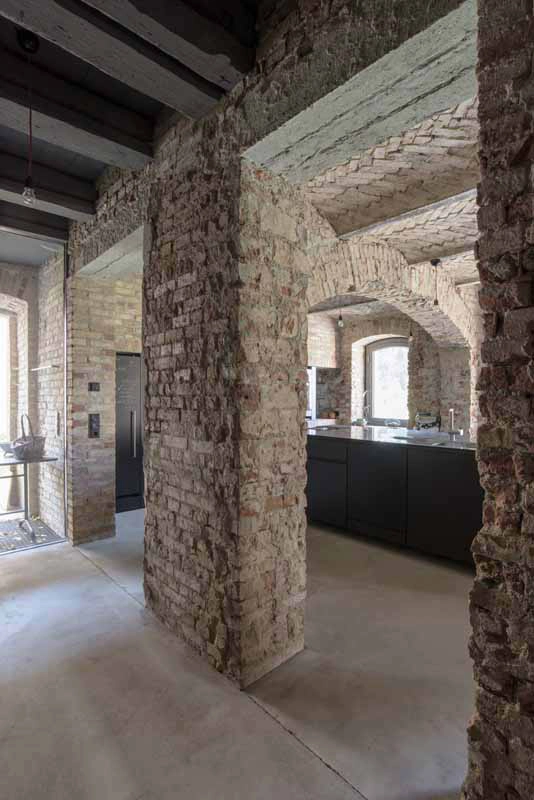 das projekt ist bestimmt durch einen diskurs zwischen dem historischen bzw. neu hinzugefügtem massiven rohen mauerwerk und den behutsam ergänzten materialen wie beton, holz, glas und stahl sowie den möbeleinbauten aus durchgefärbtem schwarzem mdf.