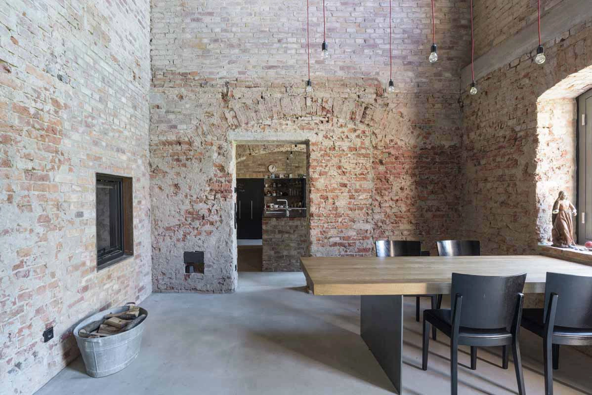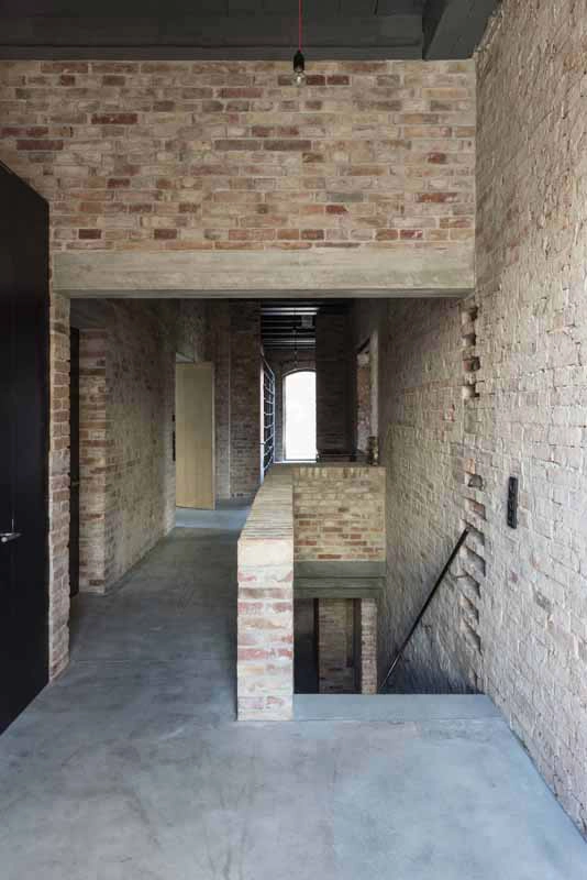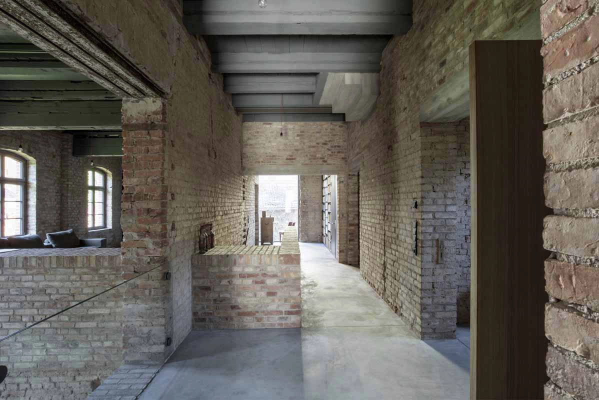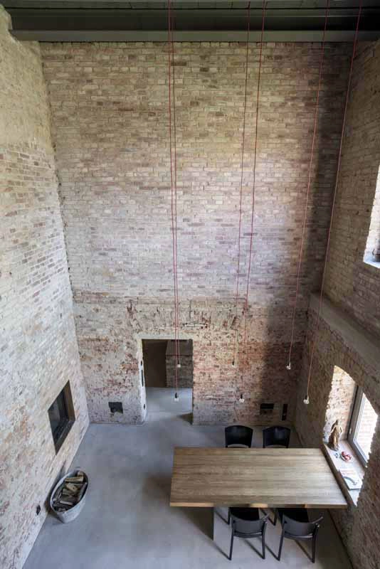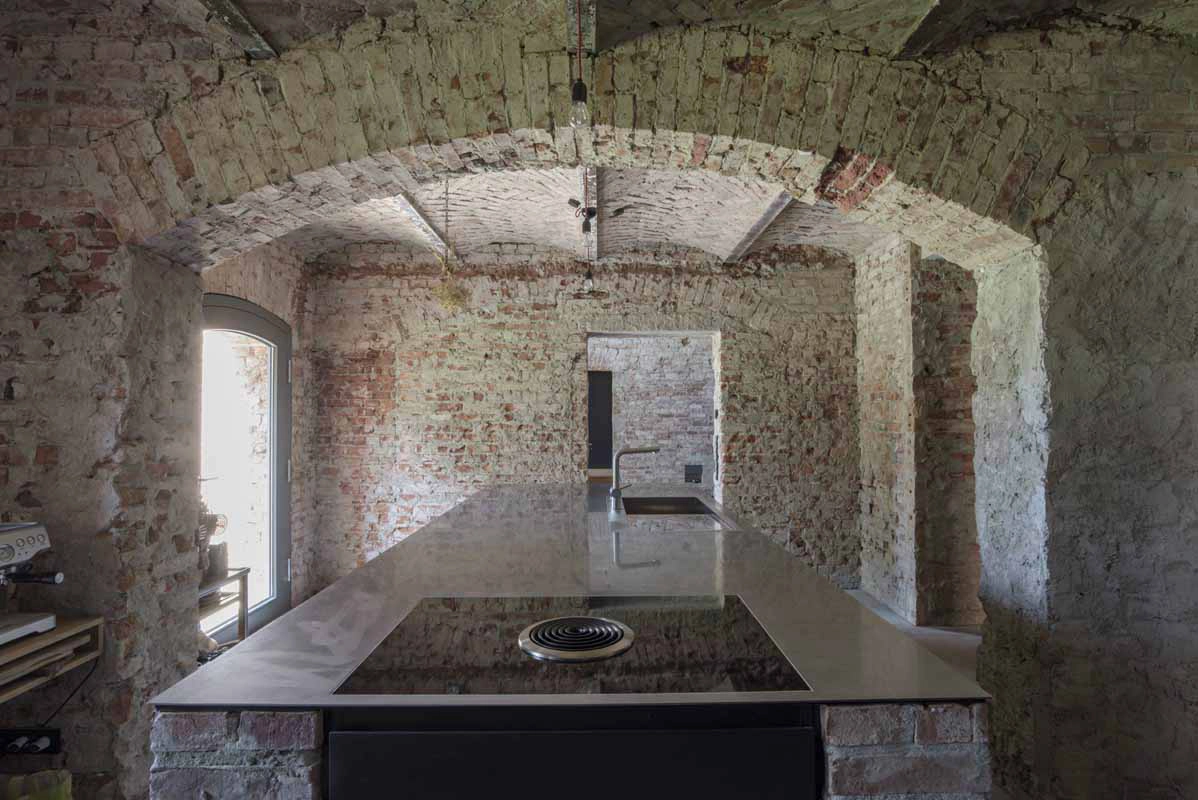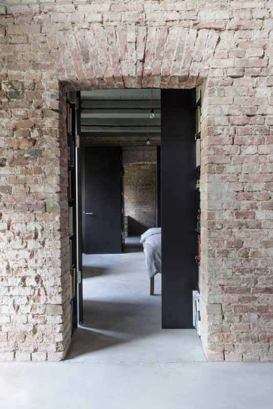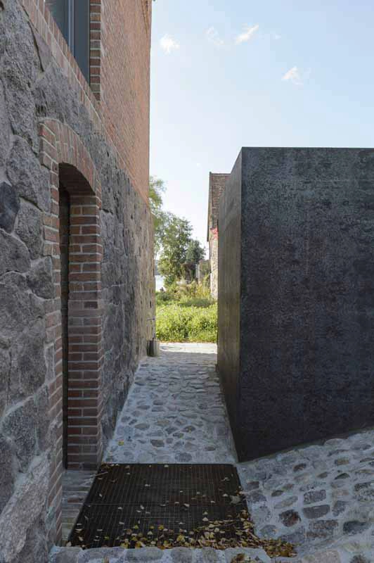 das projekt ist bestimmt durch einen diskurs zwischen dem historischen bzw. neu hinzugefügtem massiven rohen mauerwerk und den behutsam ergänzten materialen wie beton, holz, glas und stahl sowie den möbeleinbauten aus durchgefärbtem schwarzem mdf.