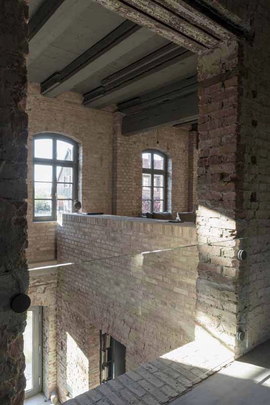 in abstimmung mit dem landesamt für denkmalpflege wurden entsprechende lösungen, so zum beispiel die farbwahl für das schließen der fassadenöffnungen, gemeinsam erarbeitet und festgelegt. die wirkung der außenfassade wurde auf ein ursprüngliches maß zurückgesetzt. die idee war der bestehenden architektur mit ihren neuen bewohnern eine ganz eigene und neue identität zu verleihen. ein scheinbar alltägliches thema wird zu einem ganz besonderen, das wohnen im historischen bestand.