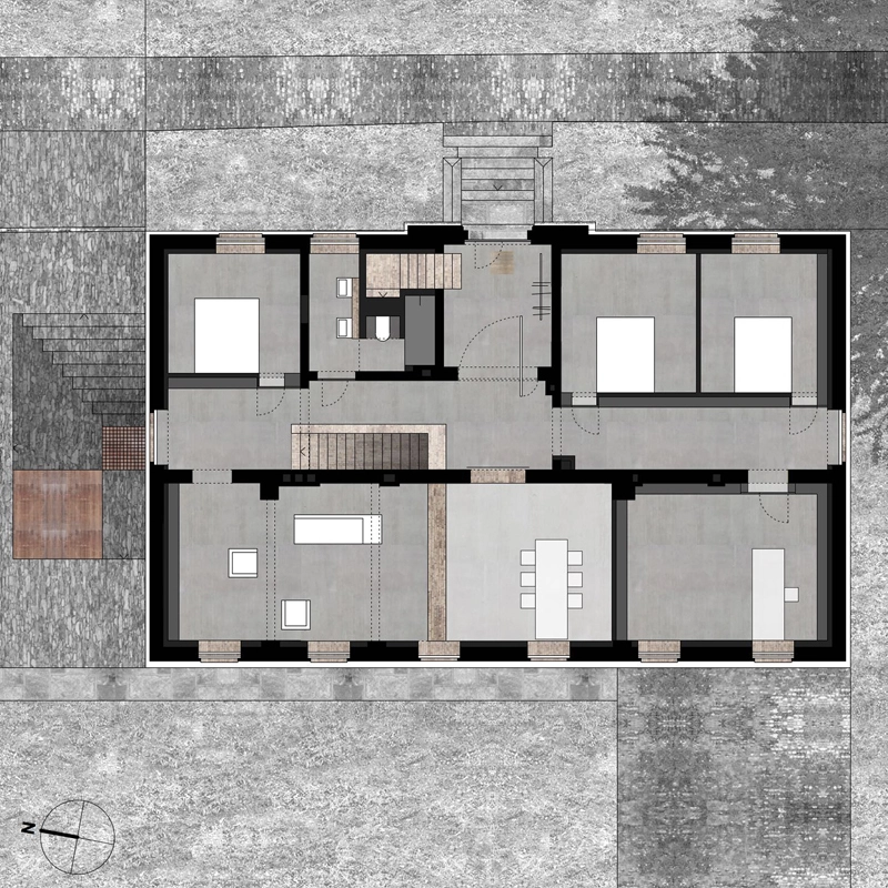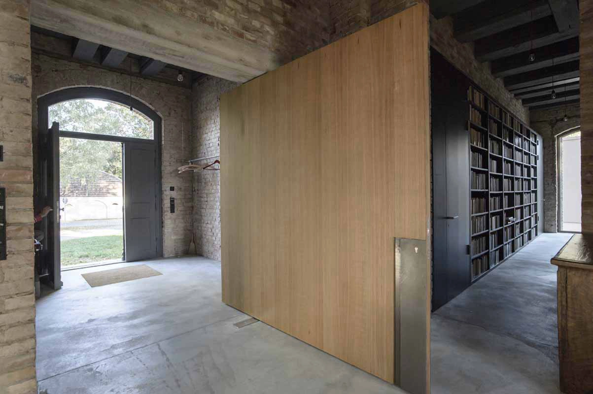 von dem eher öffentlichen, straßenseitigen eingang gelangt man zunächst in den entréebereich des hauses mit einer garderobe. von hier erschließt sich durch ein großes pendeltor, über die korridorbibliothek das erdgeschoss. der korridor bildet die querverbindung zwischen nord- und südgiebel und bietet sowohl den einblick in den essbereich des untergeschosses als auch den ausblick zu aus den beiden giebeln mit den großformatigen festverglasungen in den bestandsöffnungen.