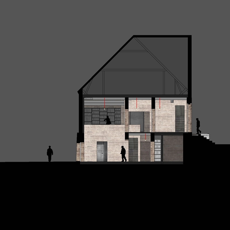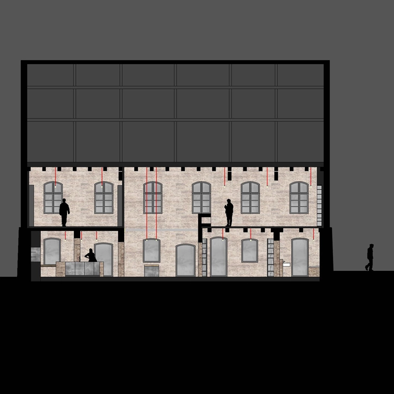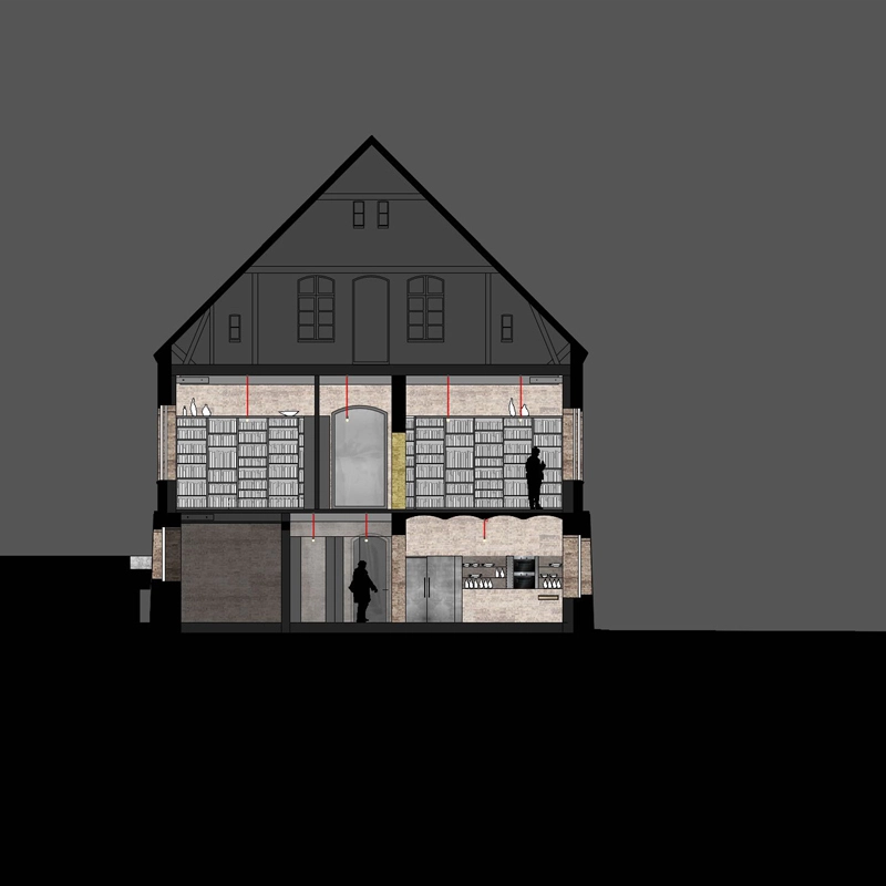 erschlossen wird das gebäude über mehrere, mehr oder weniger öffentliche zugänge. auf der strassenseitigen breiten backsteinfassade gelangt man über den ursprünglichen und historischen gebäudezugang in das erdgeschoss, an den giebel im untergeschoss sind für den eher privateren zutritt tiefe öffnungen (löcher) im giebelmauerwerk vorgesehen, welche hier den blick über die gesamte querachse des gebäudes freigeben.