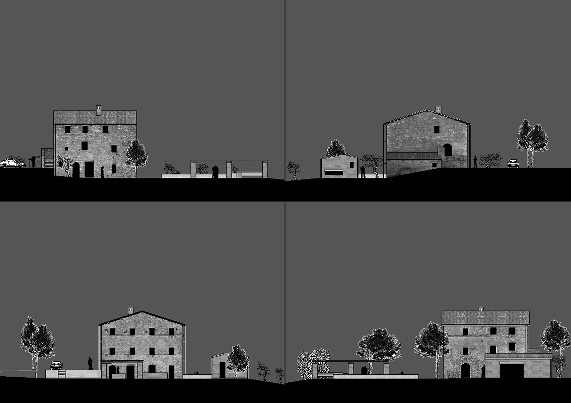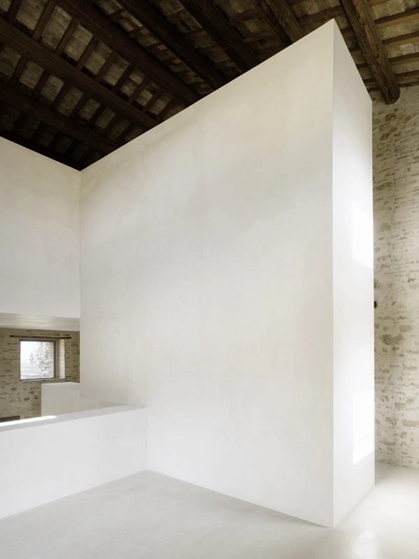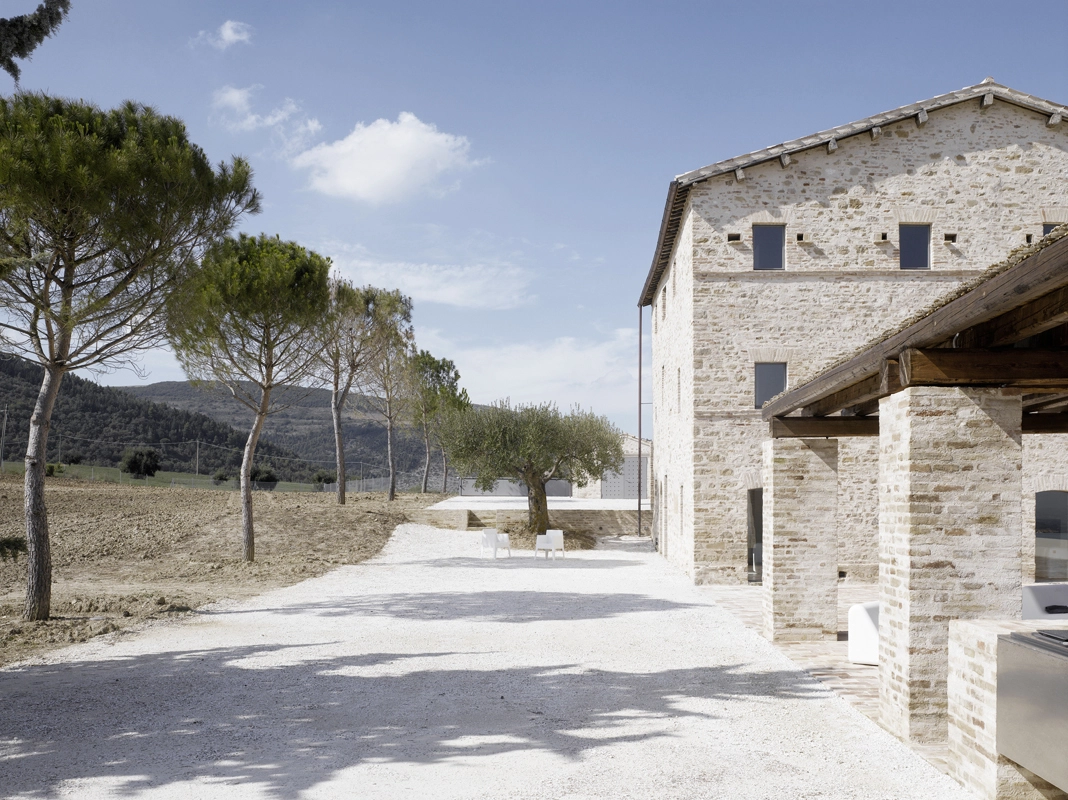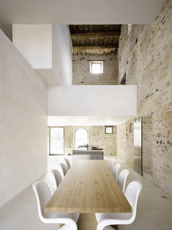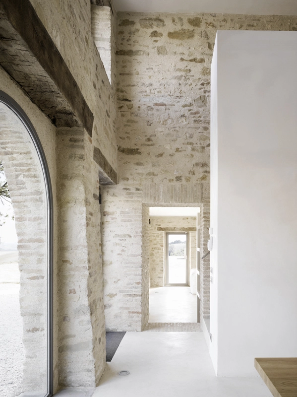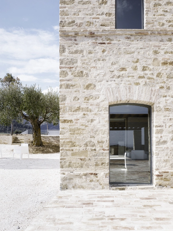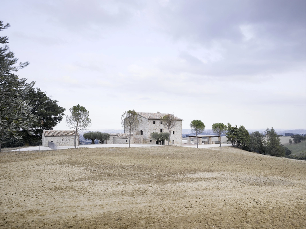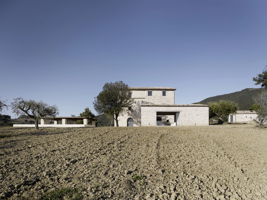 die architektur thematisiert das zusammentreffen von alter substanz und neuen eingriffen, teils kontrastierend, teils verschmelzend. so wurde die dachkonstruktion traditionell ersetzt (primär- und sekundärbalken in holz, dachuntersicht aus tonplatten, dacheindeckung mit coppiziegeln) während die neuen zwischendecken und neuen innenwände weiss verputzt, und die fussböden mit einem hellen fugenlosen steinbelag beschichtet wurden. die neuen grosszügigen weissen flächen im innern dienen der lichtreflektion, sodass sämtliche historischen, relativ kleinen fensteröffnungen in der originalgrösse und -proportion erhalten werden konnten, und dennoch alle räume in frischer helligkeit erstrahlen. die originale tragstruktur der steinmauern, wie auch die klare zweiteiligkeit des grundrisses des haupthauses wurden beim umbau respektiert und weitgehend erhalten. so wurde im südteil im erdgeschoss wohn- und cheminéeraum eingefügt, in den zwei geschossen darüber insgesamt vier schlafräume mit je eigenem bad und wc,während im nordteil - inspiriert von der brandruine - eine bis unter das dach offene und luftige koch- und esshalle entstand, in welcher drei verschieden dimensionierte weisse kuben eingeschrieben wurden, enthaltend eingangsgalerie, treppe und arbeitsraum. die kochinsel aus zeitgemässem chromstahl spiegelt die wärme des historischen gemäuers der umgebung. der ehemalige stall östlich des haupthauses wurde abgebrochen und an gleicher stelle unter verwendung der alten backsteine ein gästehaus neu erstellt, der offene unterstand südlich wurde durch eine analog dimensionierte offene loggia mit aussenküche ersetzt. das schwimmbecken wird mit klaren geometrischen bezügen zu haupthaus, gästehaus und loggia gesetzt und erinnert in seiner plastischen gestaltung an einen grossen brunnen. das nördlich gelegene bestehende nebengebäude wurde für heizzentrale und haustrechnik umgenutzt, in welches auch das automatische arealtor eingeschoben wird, und markiert die architektonisch neue eingangssituation zum anwesen. das ensemble wird neu gefasst durch eine pinienallée im westen und einen olivenhain im osten und fügt sich so mit neuem leben in die hügellandschaft der marche ein.