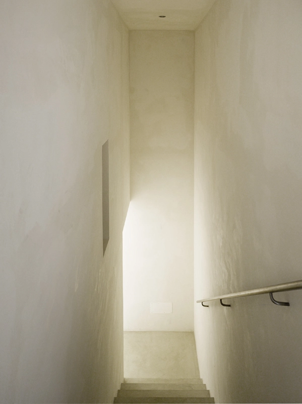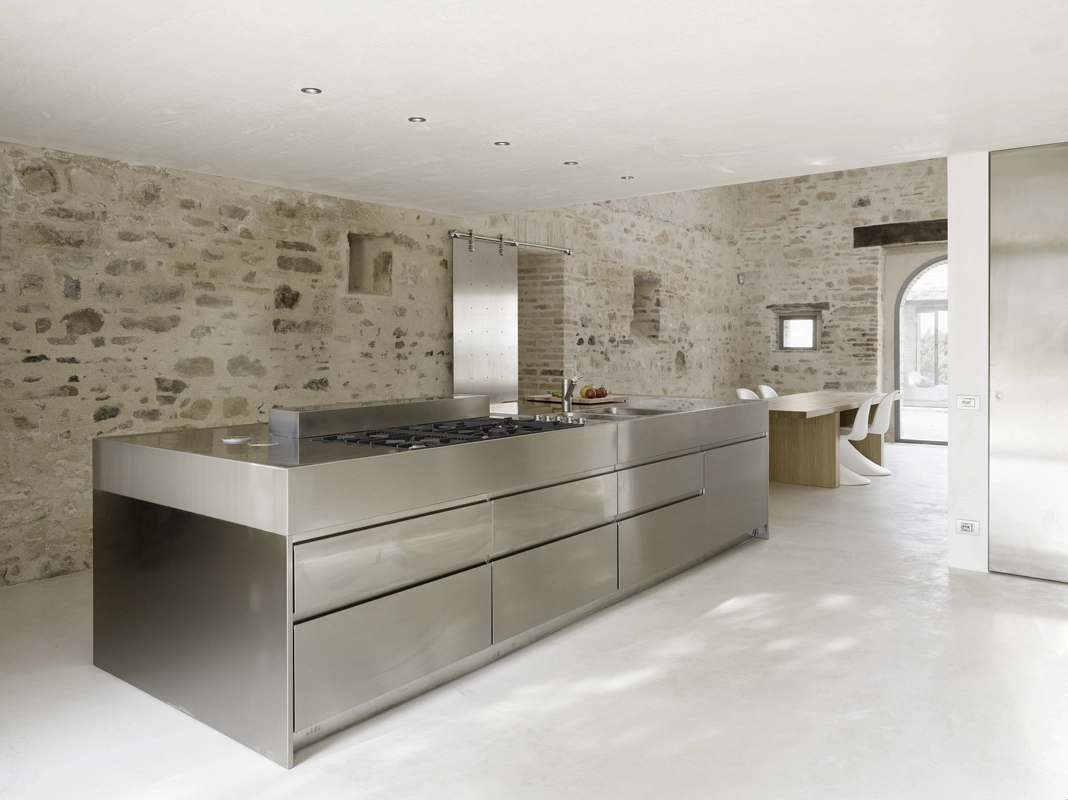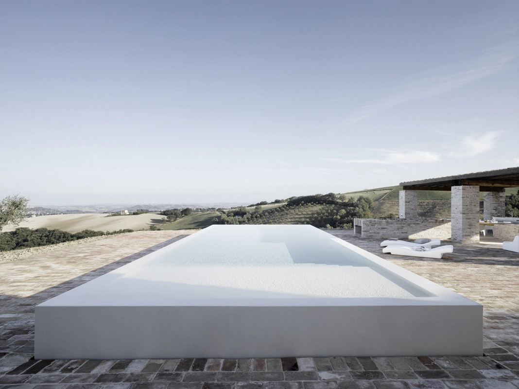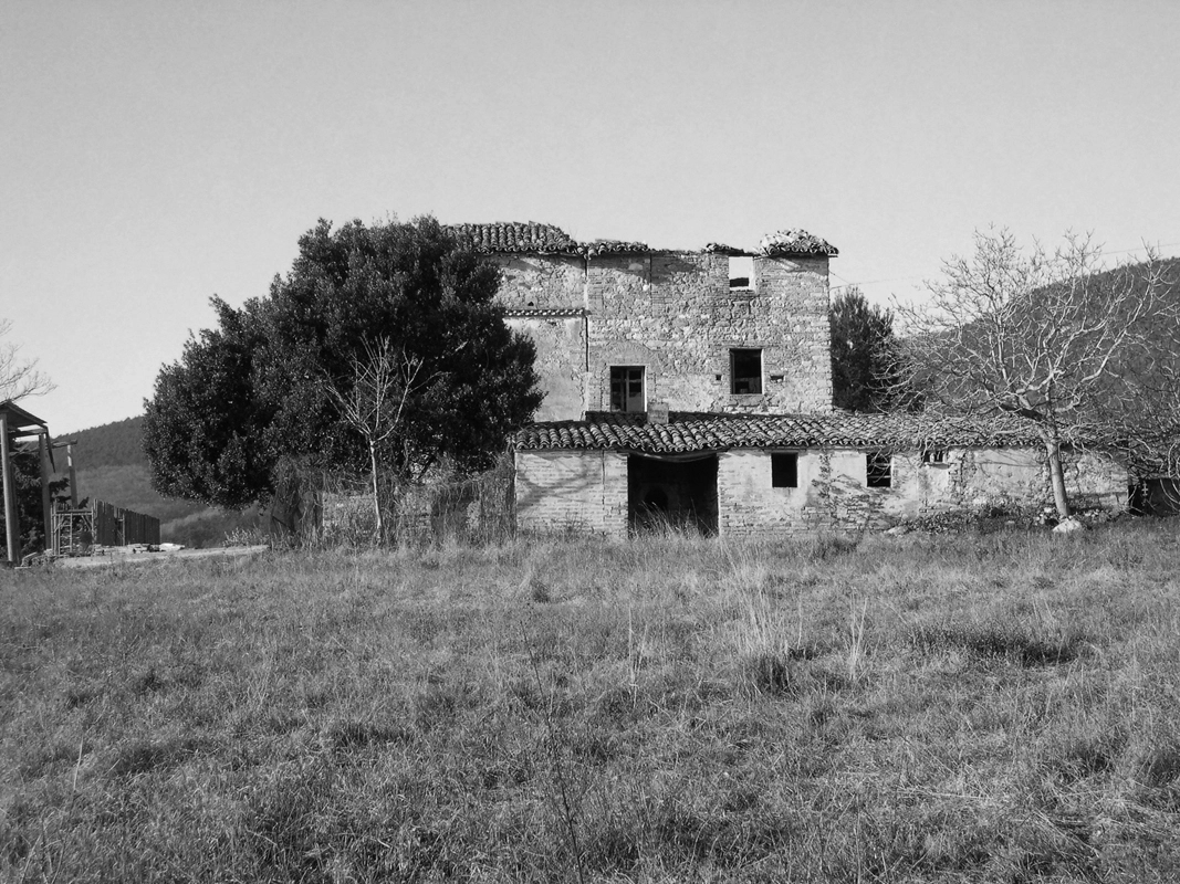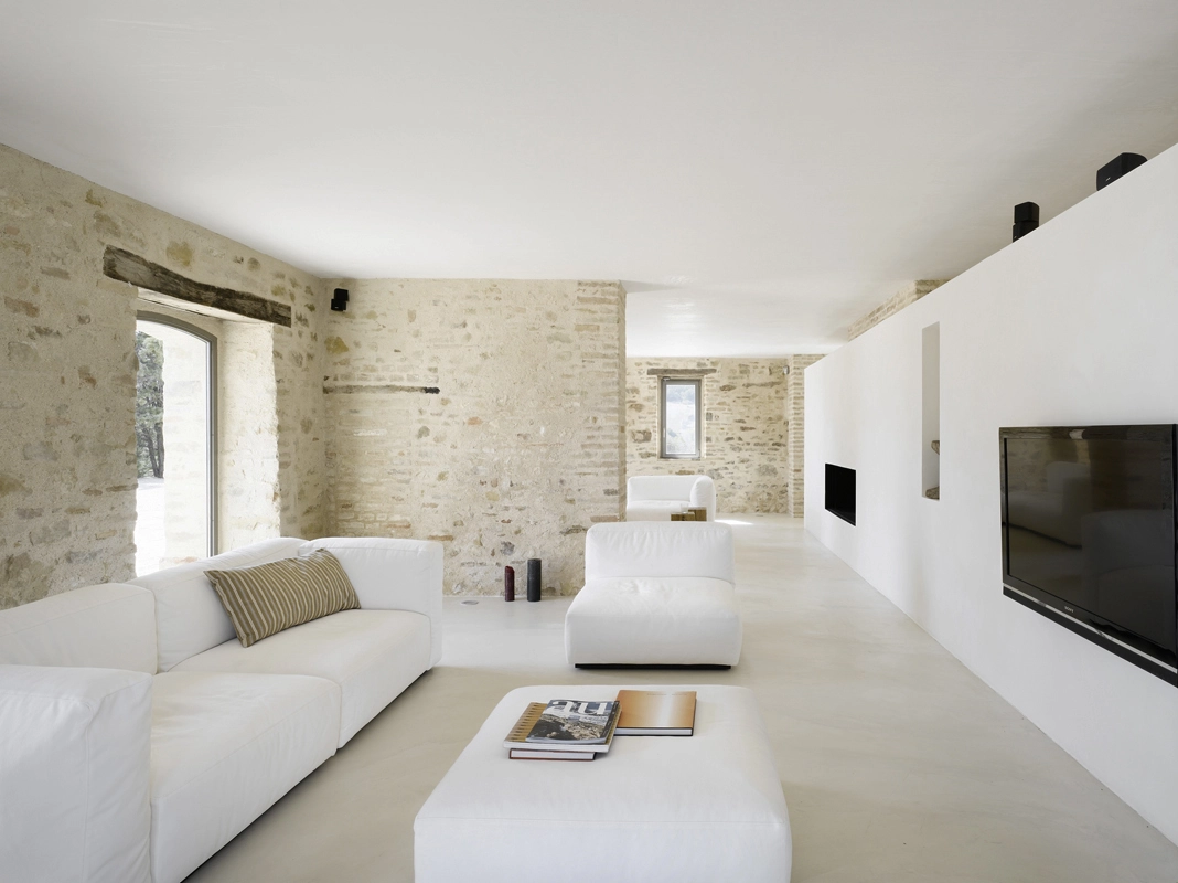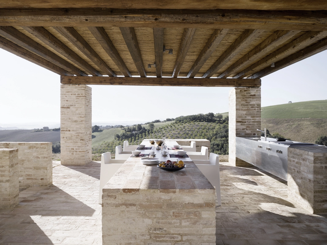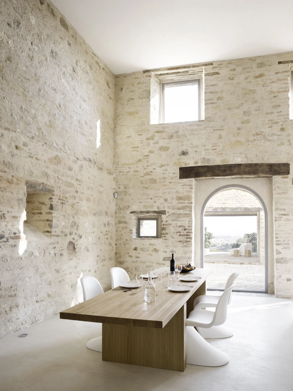 die architektur thematisiert das zusammentreffen von alter substanz und neuen eingriffen, teils kontrastierend, teils verschmelzend. so wurde die dachkonstruktion traditionell ersetzt (primär- und sekundärbalken in holz, dachuntersicht aus tonplatten, dacheindeckung mit coppiziegeln) während die neuen zwischendecken und neuen innenwände weiss verputzt, und die fussböden mit einem hellen fugenlosen steinbelag beschichtet wurden. die neuen grosszügigen weissen flächen im innern dienen der lichtreflektion, sodass sämtliche historischen, relativ kleinen fensteröffnungen in der originalgrösse und -proportion erhalten werden konnten, und dennoch alle räume in frischer helligkeit erstrahlen. die originale tragstruktur der steinmauern, wie auch die klare zweiteiligkeit des grundrisses des haupthauses wurden beim umbau respektiert und weitgehend erhalten. so wurde im südteil im erdgeschoss wohn- und cheminéeraum eingefügt, in den zwei geschossen darüber insgesamt vier schlafräume mit je eigenem bad und wc,während im nordteil - inspiriert von der brandruine - eine bis unter das dach offene und luftige koch- und esshalle entstand, in welcher drei verschieden dimensionierte weisse kuben eingeschrieben wurden, enthaltend eingangsgalerie, treppe und arbeitsraum. die kochinsel aus zeitgemässem chromstahl spiegelt die wärme des historischen gemäuers der umgebung. der ehemalige stall östlich des haupthauses wurde abgebrochen und an gleicher stelle unter verwendung der alten backsteine ein gästehaus neu erstellt, der offene unterstand südlich wurde durch eine analog dimensionierte offene loggia mit aussenküche ersetzt. das schwimmbecken wird mit klaren geometrischen bezügen zu haupthaus, gästehaus und loggia gesetzt und erinnert in seiner plastischen gestaltung an einen grossen brunnen. das nördlich gelegene bestehende nebengebäude wurde für heizzentrale und haustrechnik umgenutzt, in welches auch das automatische arealtor eingeschoben wird, und markiert die architektonisch neue eingangssituation zum anwesen. das ensemble wird neu gefasst durch eine pinienallée im westen und einen olivenhain im osten und fügt sich so mit neuem leben in die hügellandschaft der marche ein.